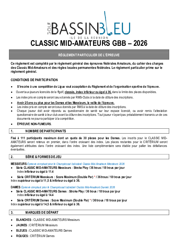 Infos supplémentaires : Compétition réservée aux : - Joueurs licenciés FFgolf âgés de 25 ans et + - Messieurs : index ≤ 11,4 - Dames : index ≤ 14,4 (pour les Index supérieurs merci de vous rediriger vers le CRITERIUM) Épreuve officielle du Championnat Individuel Classic Mid-Amateurs 2026 Boules de départs - Messieurs : blancs - Dames : bleus Les droits d'engagement comprennent les 2 jours de compétition +1 journée de reconnaissance du parcours (sur réservation). 📅 Infos importantes Clôture des inscriptions : 16 mars 2026 Publication des départs : 19 mars 2026 (12h) Remise des prix : dimanche 22 mars 2026 à 18h30 (cocktail) Voiturettes interdites (sauf médical) Épreuve non-fumeurs Index retenu à la date de clôture des inscriptions Priorité d'inscription donnée aux joueurs du Classic (puis Critérium selon index) |