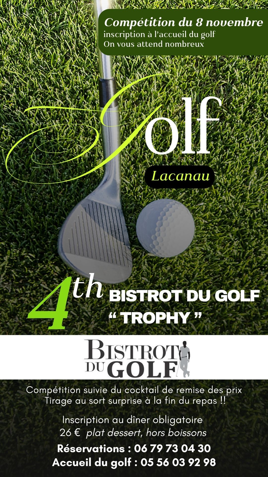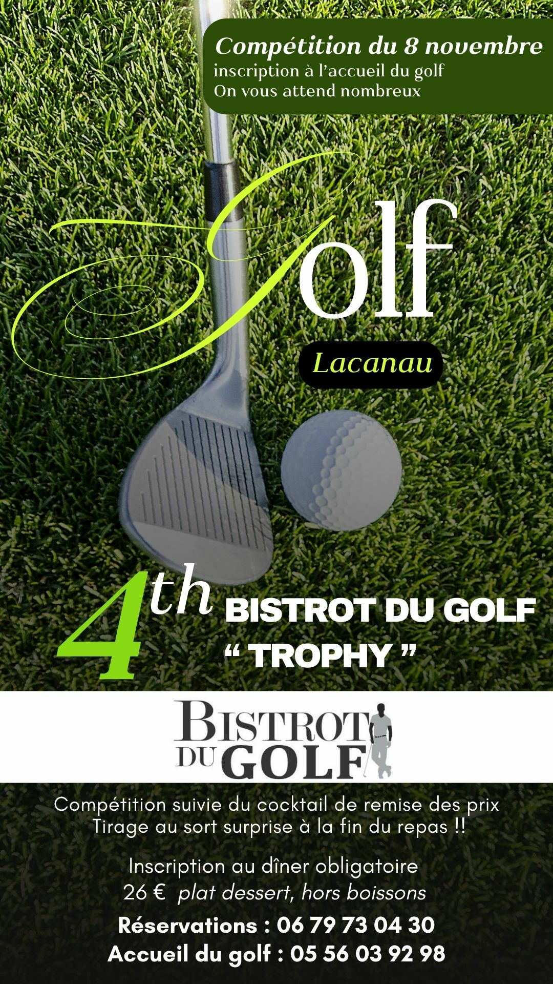 Infos supplémentaires : A partir de 8h30 : Café d'accueil & Gift. Cocktail & remise des prix en fin de journée Tirage au sort surprise à la fin du repas INSCRIPTION OBLIGATOIRE POUR LE REPAS DU SOIR : 26€/pers |