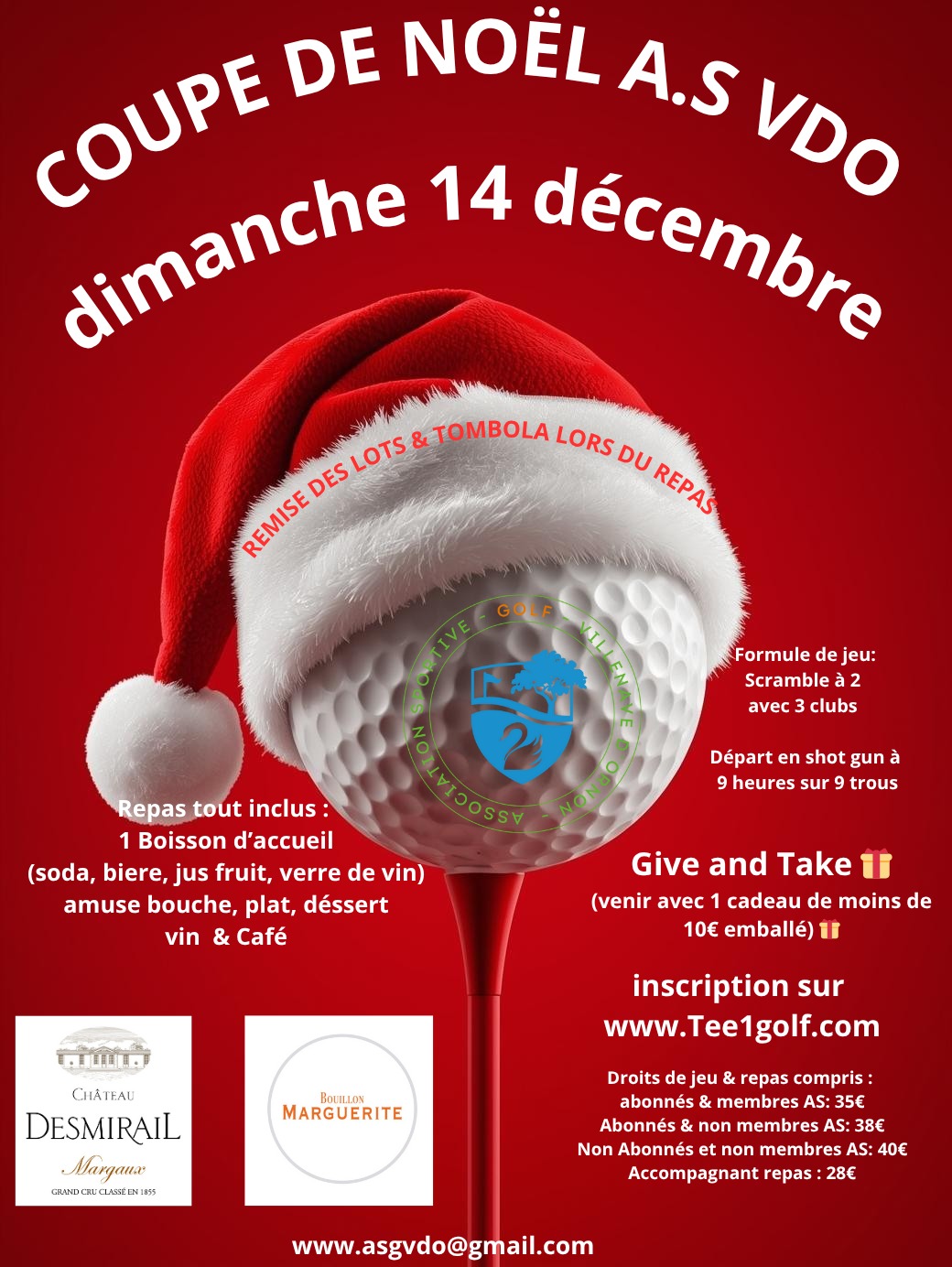 Infos supplémentaires : SCRAMBLE à 2 : 3 clubs seulement/sac Départ SHOTGUN 9h sur 9 TROUS Give and Take : apporter un cadeau emballé d'une valeur de moins de10euros TARIFS : DROITS de jeu et REPAS compris -Abonnés et membres AS : 35euros -Abonnés et non membres AS : 38euros -Non abonnés et non membres As : 40euros -Accompagnant repas : 28euros |